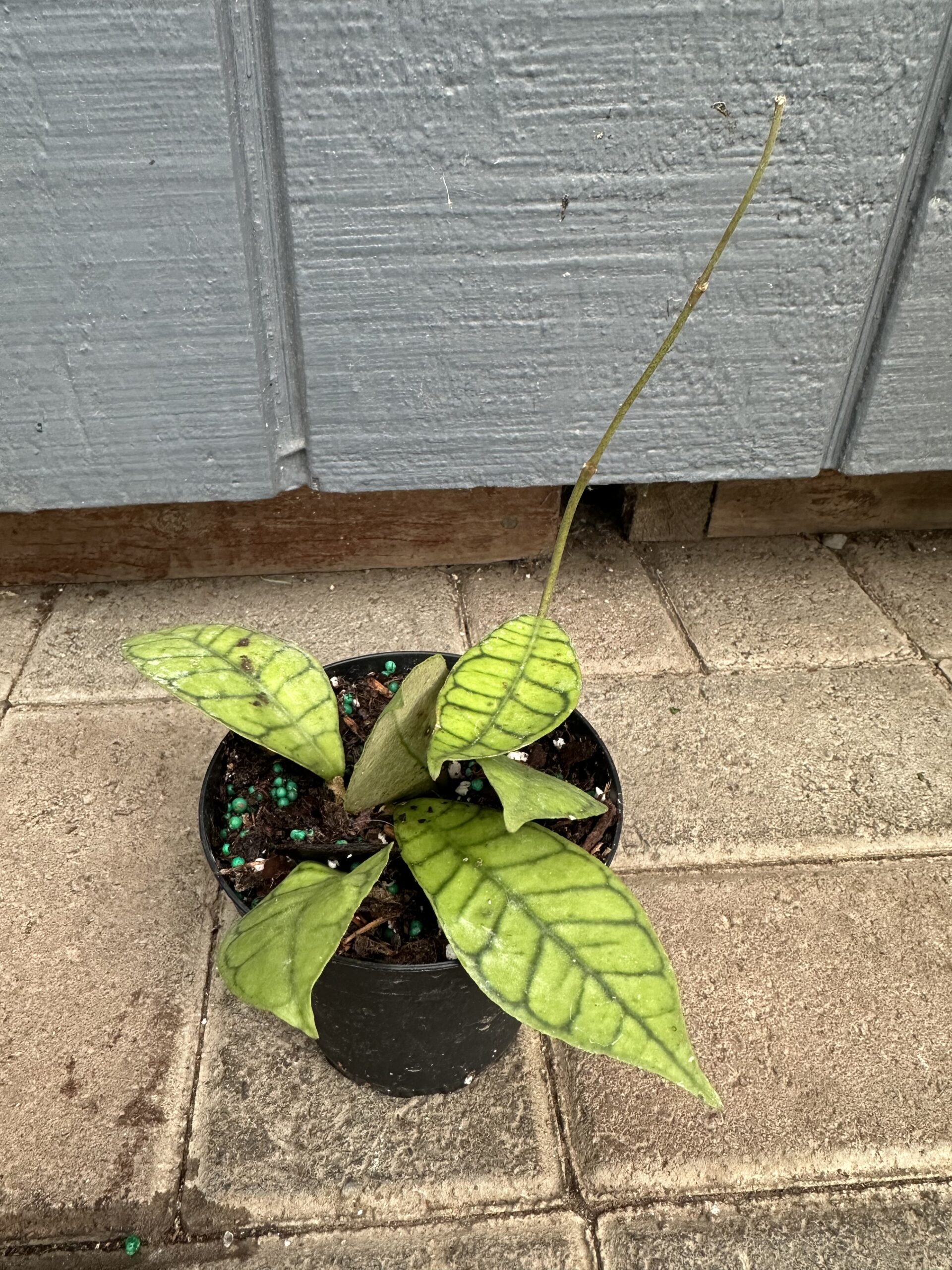 This hoya variety is popular for its thick, dark-veined leaves and fragrant white star shaped flowers. Provide plenty of bright light and a well draining soil mix for best results.